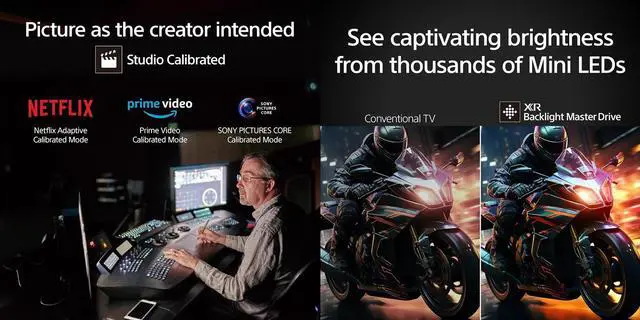 Get picture quality just as creators intended with Studio Calibrated Picture Modes. Netflix Adaptive Calibrated Mode enhances the picture by automatically adjusting brightness to your room conditions. With Prime Video Calibrated Mode, see movies, shows, and live sports the way filmmakers and broadcasters intended. SONY PICTURES CORE Calibrated Mode brings studio-quality picture mastering to your home theater. ⁴, ⁵ More Immersive Movie Experience