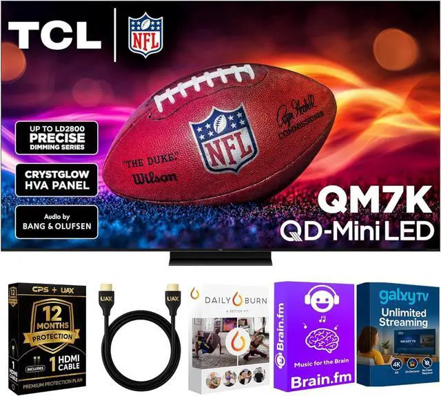 This exclusive bundle includes everything you need for a premium experience: a 12-Month CPS Protection Plan, a 6 ft UAX 4K HDMI 2.0 Cable, and a Streaming Bundle featuring Brain.fm (focus music), Daily Burn (fitness), and Galaxy TV (entertainment).