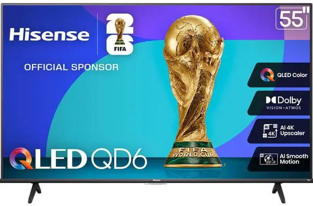 The Hisense QD6 Series gets you in on all the action. QLED Color displays over a billion brilliant shades of color on your screen, making your favorite games, shows and movies feel even more real. Dolby Vision HDR and Dolby Atmos immerse you in a world of dynamic images and all-encompassing sound, so you can see every blade of grass and hear every call of the ref. QLED Color