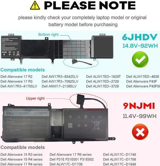• NOTE: There are 2 different batteries for your Dell laptop model and they are NOT compatible, please compare your original battery with our photos to make sure it can fit.