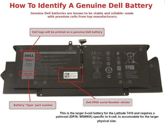 Genuine Dell OEM Original Laptop Battery for the Dell Latitude 7410 2-in-1 and Laptop. This is the larger 6-cell battery, this battery requires a 6-cell specific palmrest assembly, to accommodate the larger physical size of this high-capacity battery. You should match your part number before ordering or contact us if you're not sure which battery to select.