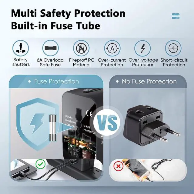Multi Safety Protection: MINGTONG Travel adapter built-in 6.3A safe fuse protect Safety Shutters LED Power Indicator Fireproof material. Provide over-current over-voltage Short-circuit Protection surge protection.