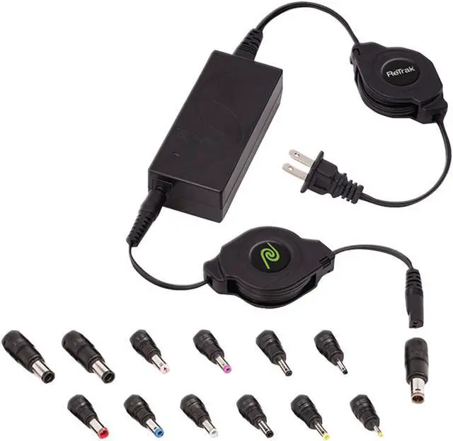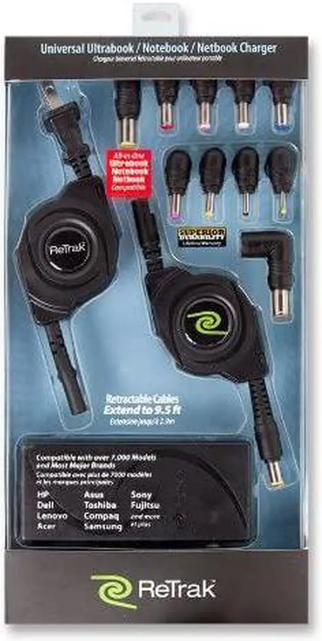 The ReTrak Universal Ultra book . Notebook . Net book Charger is a great replacement or upgrade for almost any personal computer in the market. This universal charger is truly compatible with the most popular Ultra books, Notebooks, and Net books currently in the market. With this charger, you can keep your mobile computing device charged without having to wrap your cables around the power supply. The retractable cable is great for travel yet easily expands to the desired length without the clutter of unwanted cable.