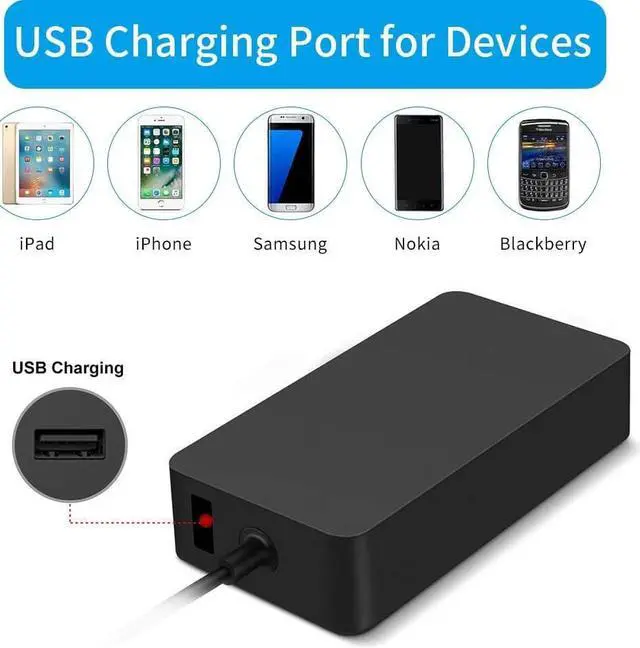 44W Power Supply quickly recharges the battery and the USB port allows you to charge another device such as your phone at the same time.