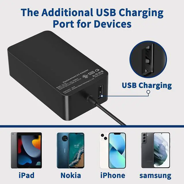 44W Power Supply quickly recharges the battery and the USB port allows you to charge another device such as your phone at the same time.