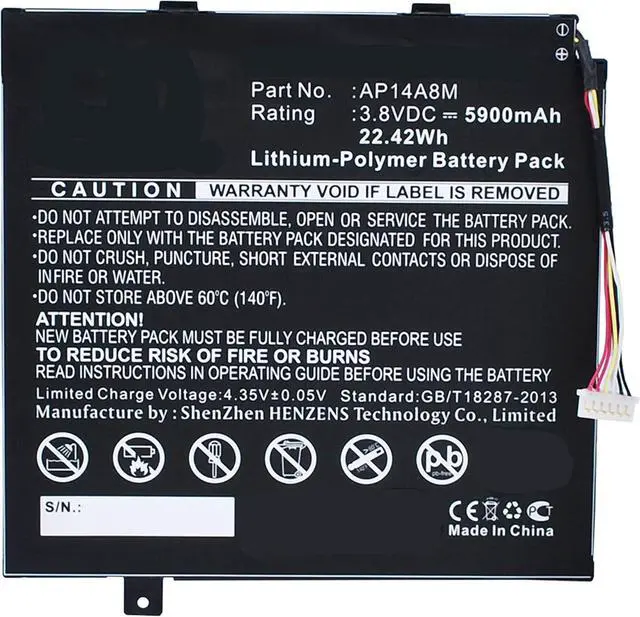 Rechargeable Battery Compatible with Acer AP14A4M, AP14A8M, KT. 0020G. 004^^Works for Acer Aspire Switch 10E(SW3-013-11GV) Tablet and many other models^^Li-Pol, 3.8V, 5900mAh^^This battery is made with high quality Japanese cells, it is designed to meet or exceed the original battery performance. ^^Long Lasting, Ultra Hi-Capacity Battery - Limited 3-Year Warranty