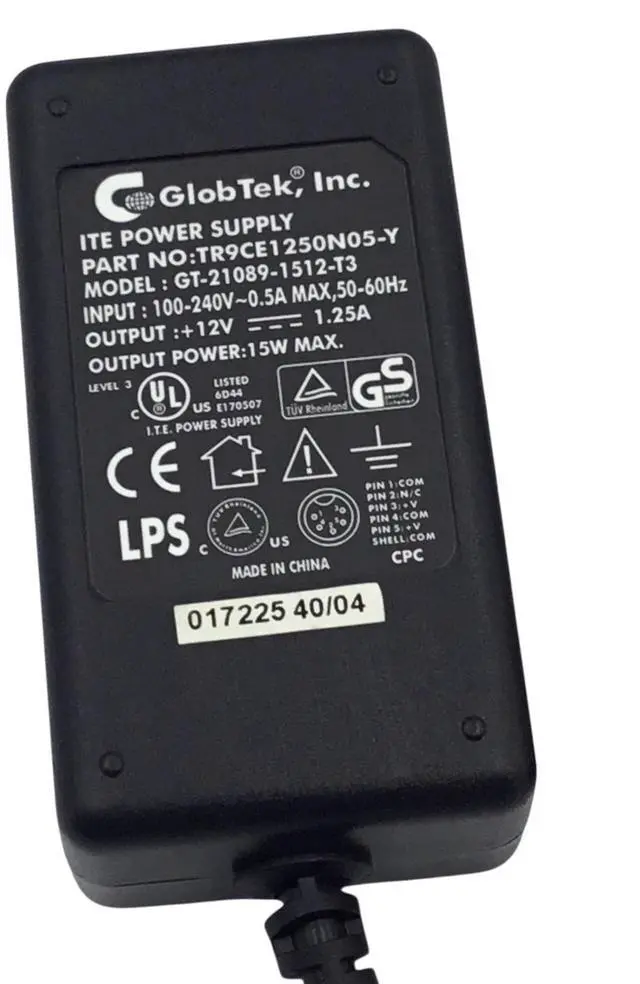 Package Includes: GlobTek GT-21089-1512-T3, TR9CE1250N05-Y Power Adapter 12V 1.25A