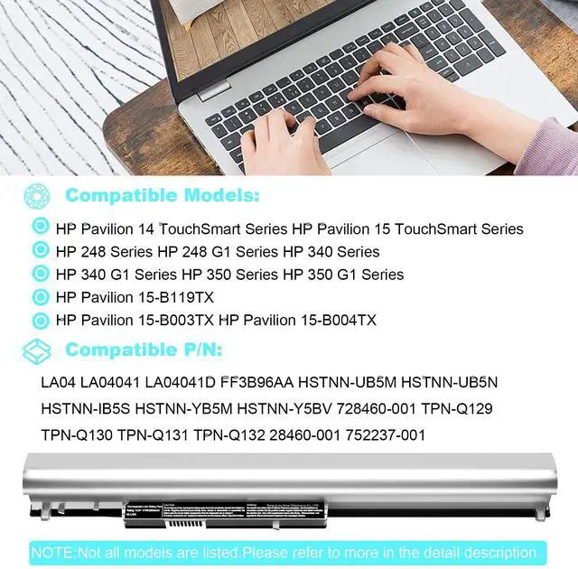 | HP Models | 728460-001, 752237-001, 776622-001, 888182064801, 888793070383, F3B96AA, F3B96AA#ABB, HSTNN- IB6R, HSTNN-UB5M, HSTNN-UB5N HSTNN-Y5BV, HSTNN-YB5M, J1V00AA, LA04, LA04041-CL, LA04041DF-CL, LA04DF, TPN-Q129, TPN-Q130, TPN-Q131, TPN-Q132 |