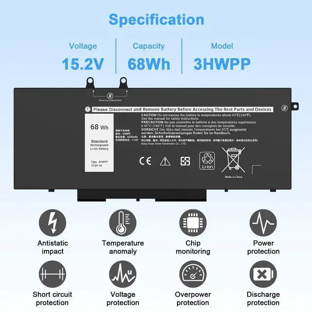 68Wh 15.2V 3HWPP Li-on Battery Replacement for Dell