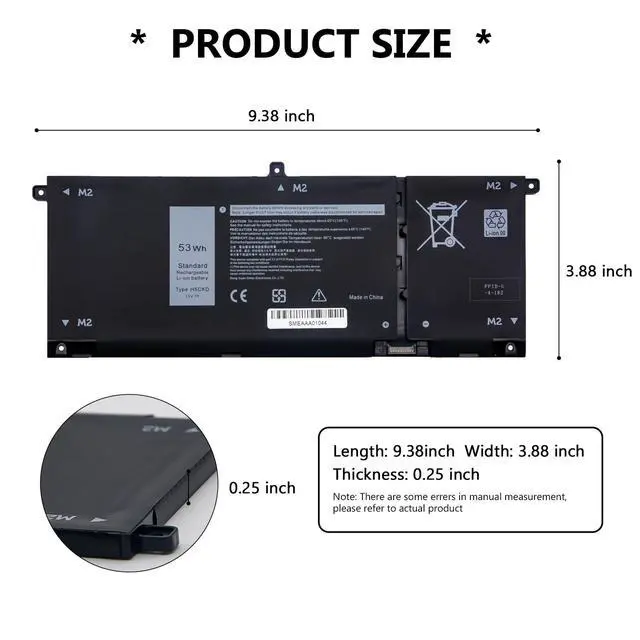 • [Specification]:Voltage:15V.Capacity: 53WH.Color: Black.Condition: 100% new from manufacturers.Package Includes:1x H5CKD Laptop Battery Replacement,2 x Free Screwdrivers, and 2 x plastic sheets for Dell Laptop Battery.If you have any questions or concerns,we will respond within 24*7 hours via emails and give you friendly after-sales service.