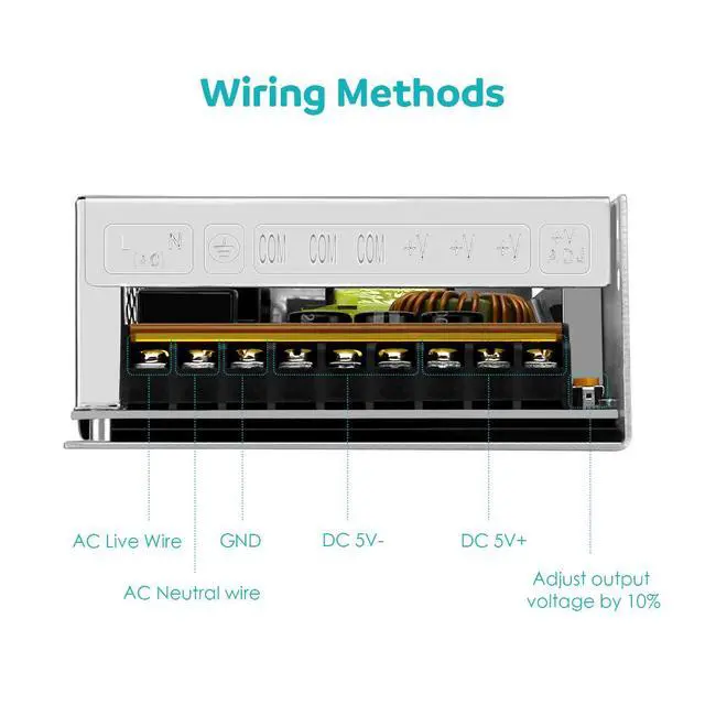 Connection instruction: L/N: AC power input +V: DC power output “+” COM: DC power output “-“ +V ADJ: Adjust the output voltage (15%)