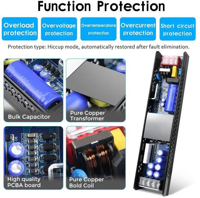 12V power supply has multiple layers of built-in protection, so you can use it safely. Overload, overvoltage, overheating, overcurrent, short circuit, leakage and other protection