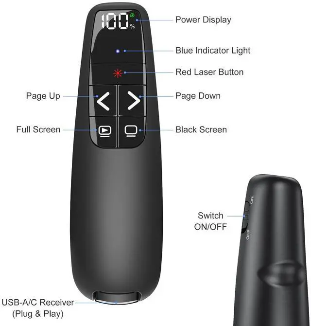 [Rechargeable & Led Digital Power Display] This Power point clicker wireless features a clear LED digital power display screen, which can help you monitor the remaining battery power and stay fully prepared easily. With its built-in large-capacity battery. One hour charging, Several weeks using.
