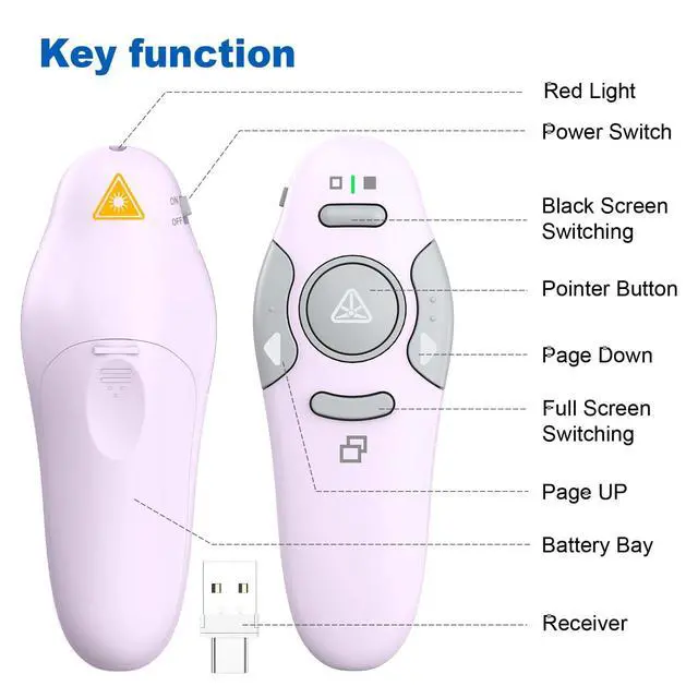 Easy to Plug & Play: Designed for easy use, this wireless presenter requires no software installation. Just insert a AAA battery (not included), plug the 2.4GHz USB receiver into your computer, and youre all set. Its a must-have for classrooms, boardrooms, and beyond