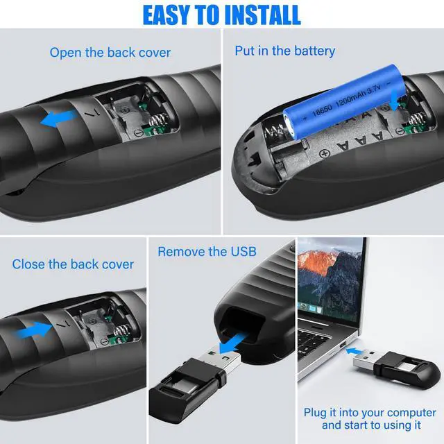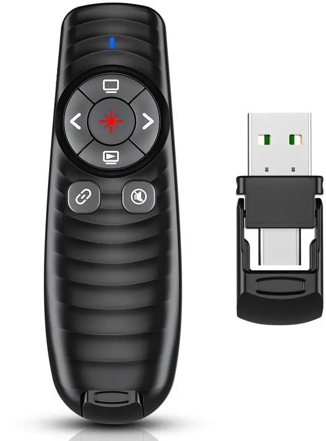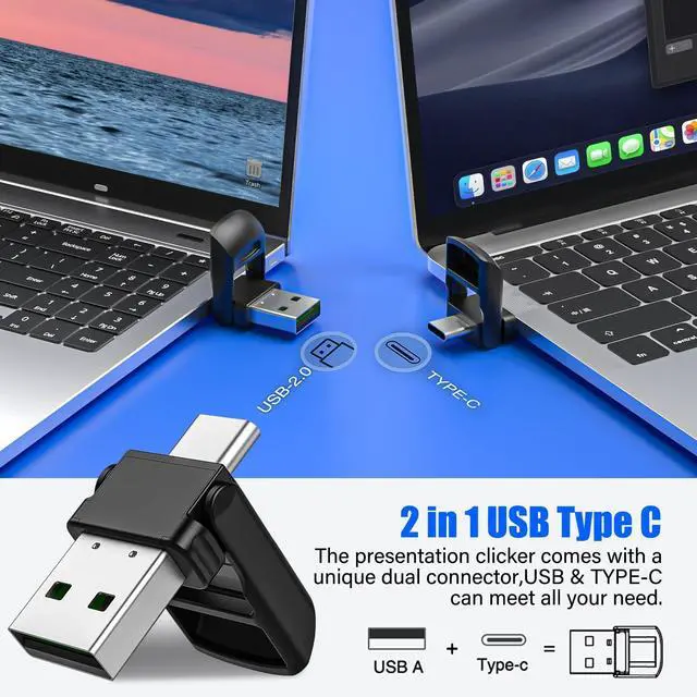 2-IN-1 USB TYPE-C PRESENTATION CLICKER & PLUG AND PLAY: 2-in-1 USB Type-c presentation clicker, which can allow you to freely switch between different port devices such as Mac, laptop and pc, etc, meet all your need. Wireless presenter is plug and play, no need to download software, simple, convenient and fast to use. The receiver has a portable design, it is easy to carry. USB receiver is embedded in the bottom of the remote to avoid losing presentations