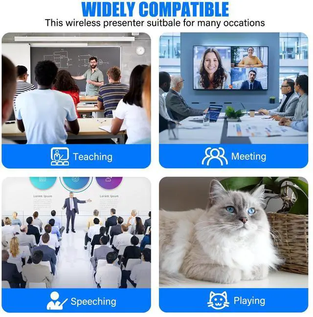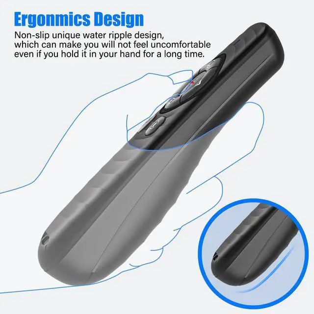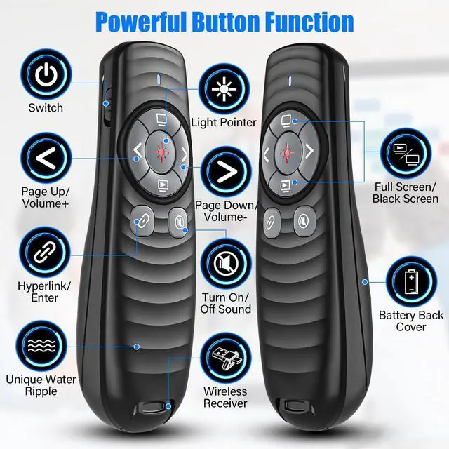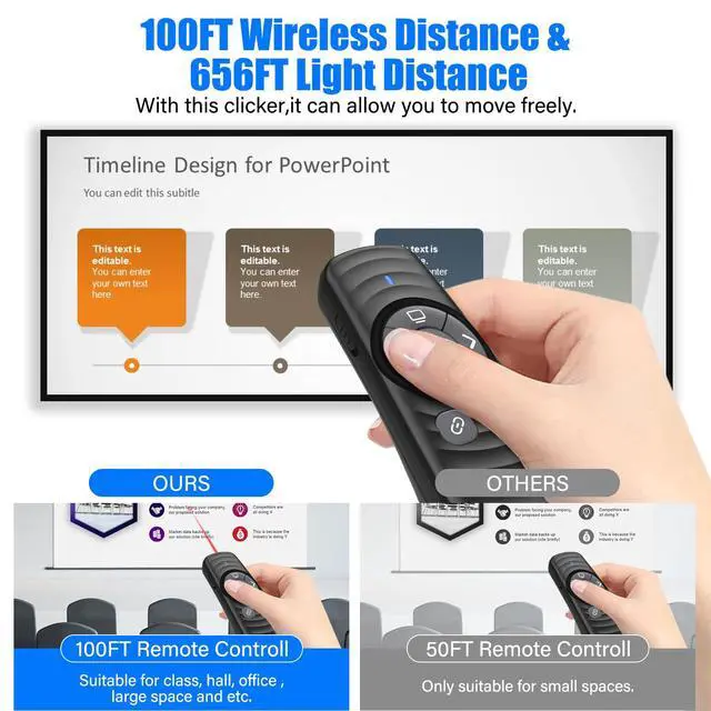 LONG CONTROL & BRIGHT RED LIGHT: Clicker for powerpoint presentations control distance: 100FT/30M, red light range: 656FT/200M. With this presentation remote, it can allow you to move freely and instead of being tied by the computer and improve interaction with the audience. Presentation clicker with red lights, which can be easily seen in most backgrounds, it is easy to point out key areas to attract the audience's attention. Wireless presenter for classroom, meeting, hall, speeching, etc