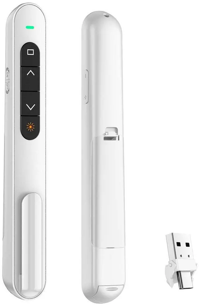 PLUG & PLAY PRESENTATION CLICKERThe intuitive touch buttons of this presenter clicker integrate hyperlink navigation, page up/down, volume control, power switch, and full screen/black screen functions. No software is required, just connect the magnetic 2.4 GHz USB receiver at the bottom of the clicker to your computer and it's ready to use. (Powered by 1 AAA Battery is not included)