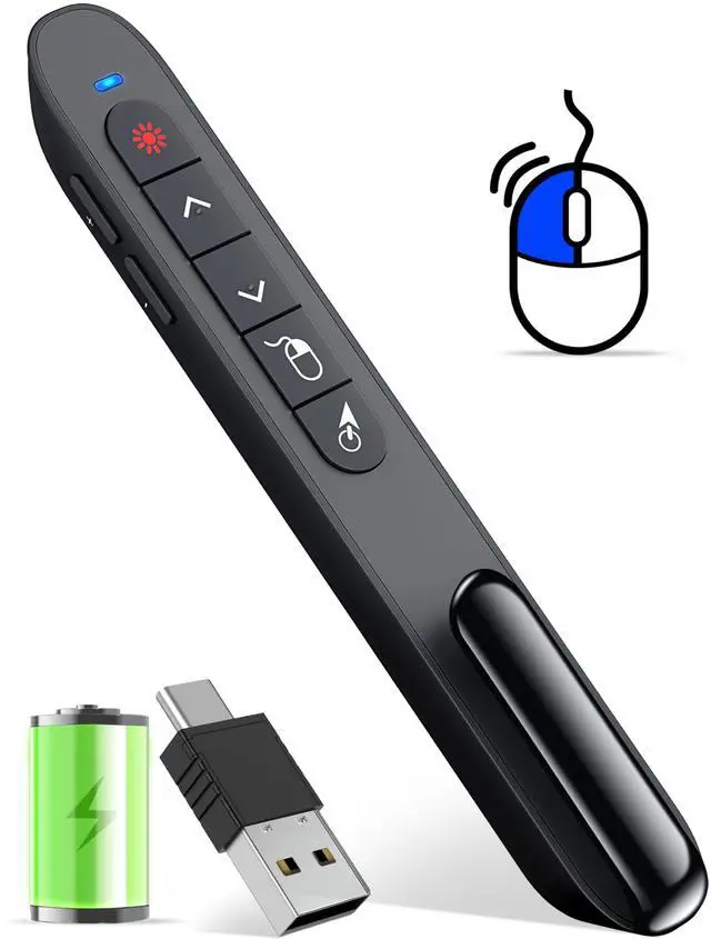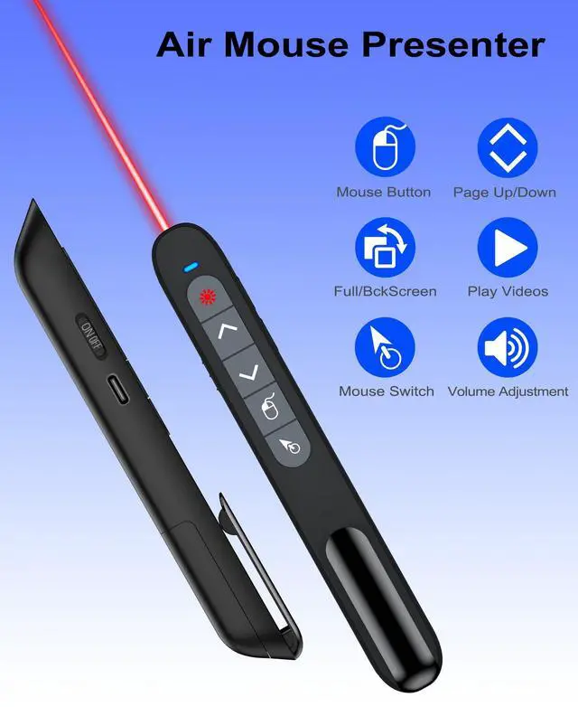Presentation Clicker with Air MouseThe pointer clicker has added an air mouse function with sensitive wireless cursor control, just like using a real mouse, such as left mouse button, right mouse button, open video or enter website, keeping the presentation smooth while moving. You can enter/exit mouse mode by clicking the cursor button