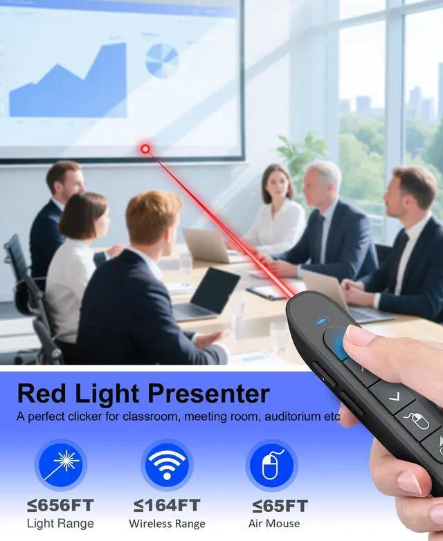 Bright Red Light & Long Control Range For 2.4G Control Range: 164FT; Red Light Range: 656FT;Air Mouse Control Range:65FT;wireless presenter remote laser point support control range is far enough for you to freely move around the room without being stuck to computer. Help you complete the slideshow control more easily