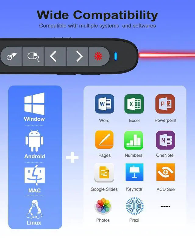 Widely ApplicableRemote clicker for presentations support systems: Windows 2003/ XP/ Vista/ 7/ 8/ 10, Mac OS, Linux, Android; Powerpoint remote clicker support software: PowerPoint, Google Slides, iWork (Keynote & Numbers & Pages), Prezi, PDF, MS Word, Excel, ACD See, Website and etc