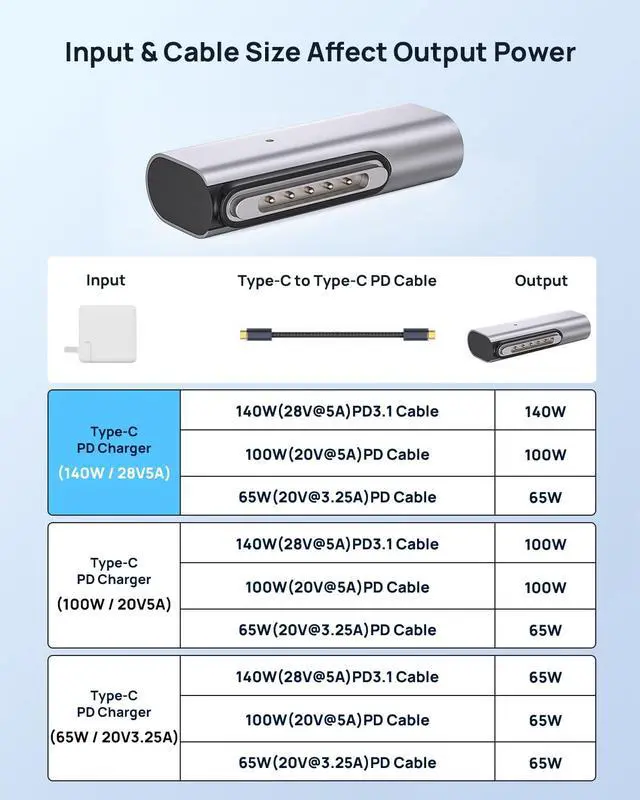 140W Fast Charging You must use a 20V/3.25A 65W or higher Type-C charger and USB-C PD cable, otherwise the adapter will not work. If you want to achieve a charging speed of 140W, please use a 140W PD charger and USB C PD 3.1 cable. This magnetic adapter only supports charging, cannot transfer data.