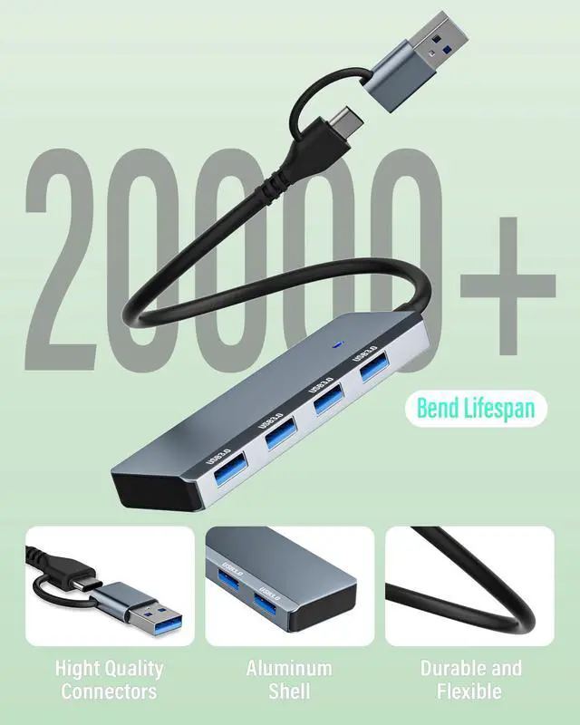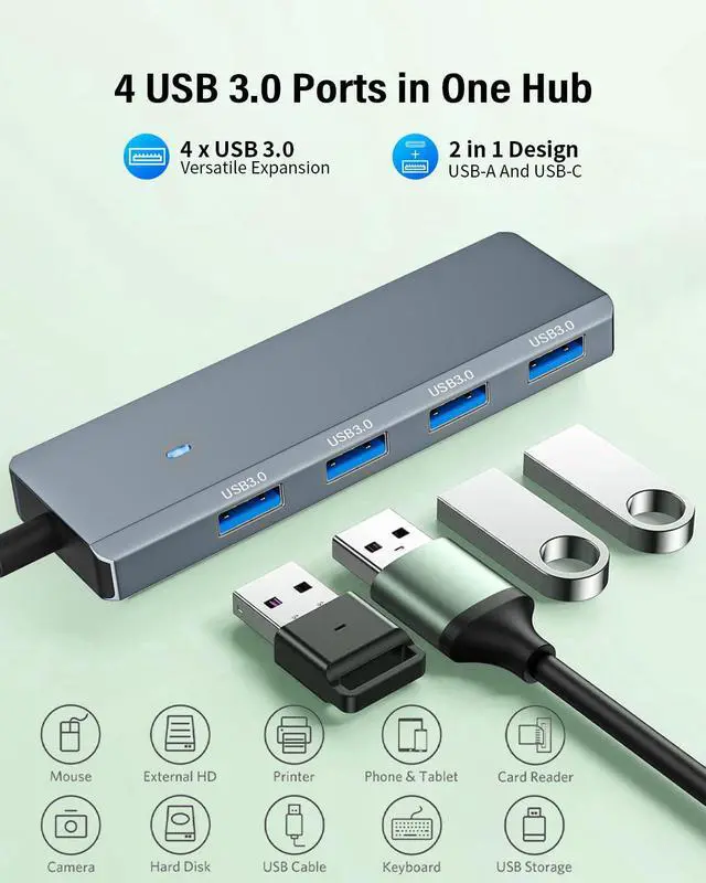 USB Hub, Aluminum 4-in-1 5Gbps Data Hub with 4 USB-A 3.0 Ports, 2-in-1 USB Connector, for USB-A and USB-C Laptop, MacBook, iPad and More. 4-Port Ultra-Slim USB Hub USB Splitter USB Expander for Mouse, Keyboard, Flash Drive, U Disk, Printer, HDD, Console, Printer, Camera, Compatible with Laptop, Desktop PC, Smartphone, Xbox, PS5, and More (Not for Charging)