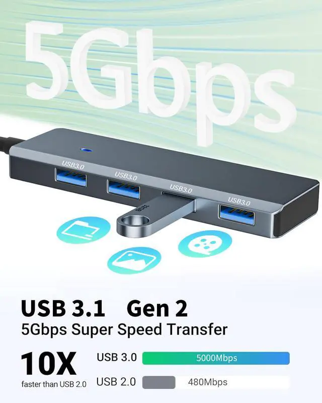 The USB 3.0 Hub supports a max file transfer speed of 5Gbps. That's fast enough to transfer a 10 GB file in just 16.4 seconds
