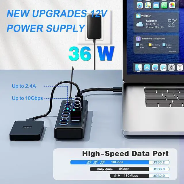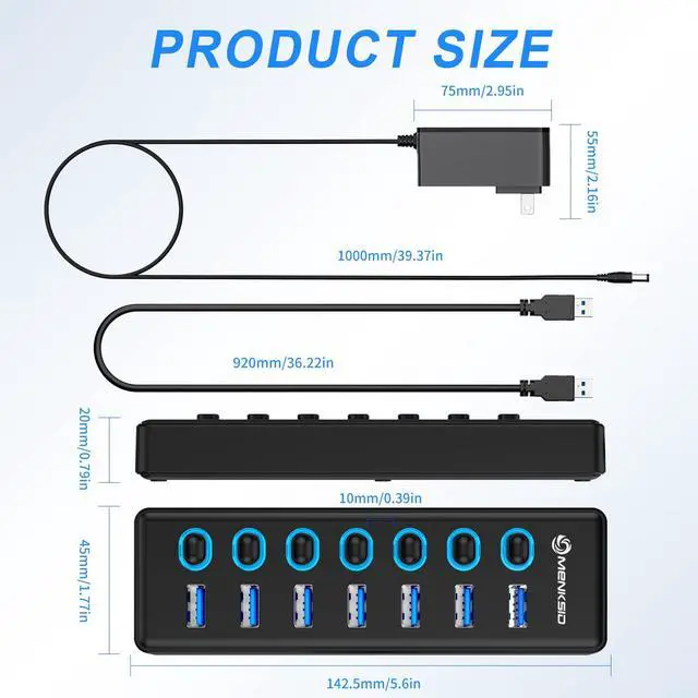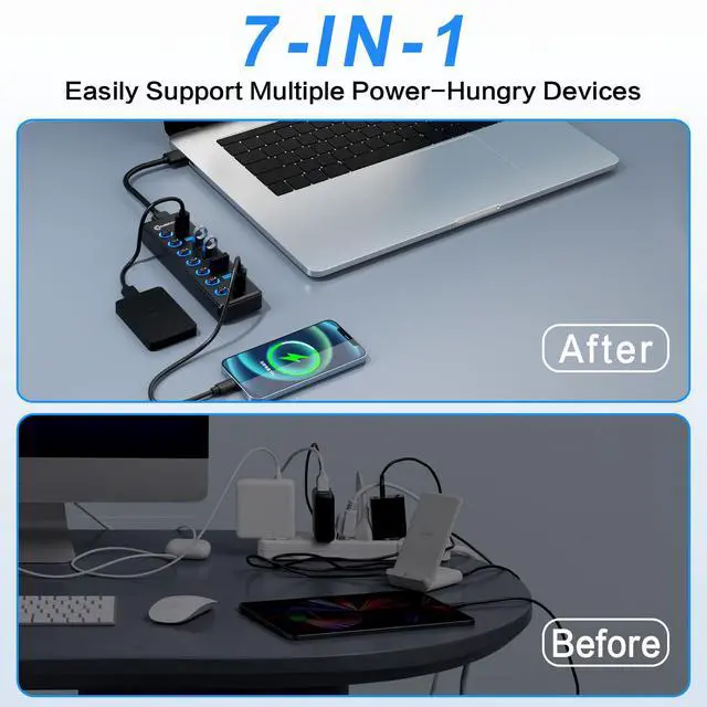 Transform your single USB port into a powerhouse of connectivity with this versatile 7-port USB 3.2 hub. Each port features individual on/off switches with LED indicators, giving you complete control over your connected devices. The generous 3.3-foot cable provides flexibility in placement, while the USB 3.2 technology ensures swift data transfer speeds. This hub is thoughtfully designed to be universally compatible with a wide range of devices including laptops, PCs, MacBooks, Mac Pro, Mac Mini, iMac, and Surface Pro. Perfect for both home office setups and professional workstations, this hub helps eliminate the frustration of limited USB ports. The individual switches allow you to manage power distribution efficiently, and the LED indicators provide clear visual feedback of active connections. Whether you're connecting multiple peripherals, storage devices, or charging your gadgets, this hub streamlines your digital workspace with reliable performance.