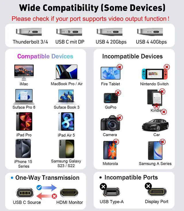 Versatile Compatibility: Type C to HDMI Adapter is compatible with all laptops, tablets and smartphone devices that support DP Alt Mode; Compatible with MacBook Pro/Air, iMac Pro, Dell XPS 13/15/17, iPhone 15/16 series, Samsung Galaxy S22/S23/S24/25, etc. It is perfect for devices equipped with USB 4 and Thunderbolt 3/4/5 ports, and is an essential part of your modern technology life