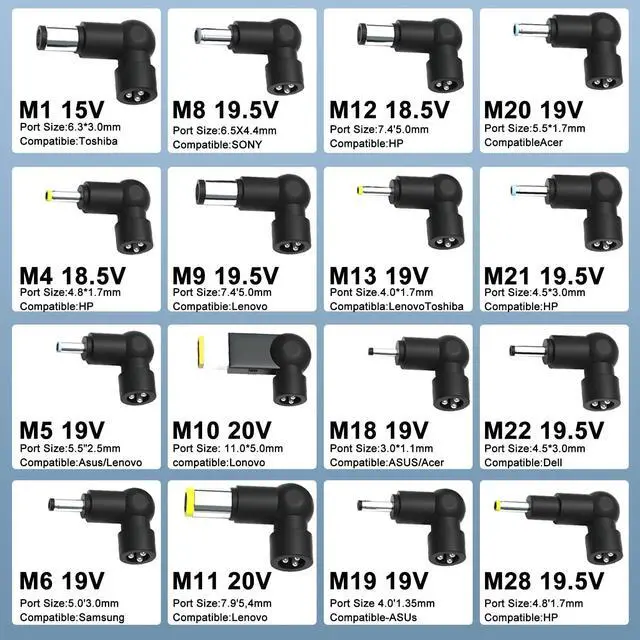 [Ultimate Compatibility] 16 Tips to Unlock 1000+ Models. Stop worrying about "will it fit?" Our set includes 16 precision-engineered tips that cover 99% of popular laptops. From HPs "Smart Blue Tip" and Lenovos "Yellow Square" to Dell, Asus, Acer, and Samsung. It perfectly replaces 90W, 65W, and 45W adapters, making it the only backup charger your household will ever need.
