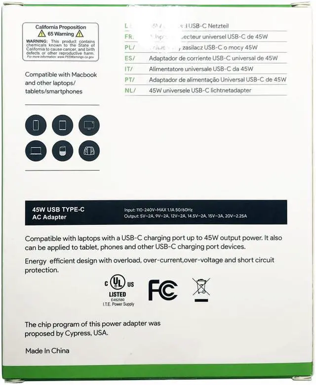 OUTPUT: 5V 2A, 12V 2A, 14.5V 2A, 15V 3A, 20V 2.25A
