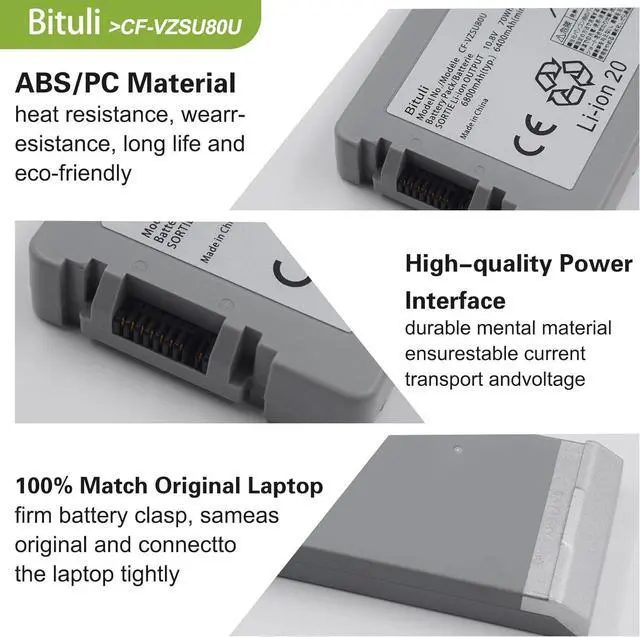 Compatible Part Numbers:CF-VZSU80UCompatible Part Numbers:CF-VZSU82U CF-VZSU83U VZSU80UCompatible Machine Models:Panasonic Toughbook CF-C2Compatible Machine Models:Panasonic Toughbook CF-C2AECCHCE Series Bituli-worthy of trust. How To MaximizeThe Battery Life? Why The Laptop Does Not Recognize The New Battery Laptop Maintenance Tips: Bituli Battery for HP Bituli Battery for MacBook Bituli Battery for Panasonic Bituli 4-cell Battery Bituli Battery for DELL Bituli battery packs are comprised of grade "A" cells with top quality ion battery materials that ensure Reliable performance extended battery life. Bituli CF-VZSU80U,Laptop Battery Replacement for Panasonic CF-C2 Series Toughbook Tablet PC Series Notebook CF-VZSU83U CF-VZSU82U CF-C2AECCHCE Item:Bituli CF-VZSU80U Replacement Battery for Panasonic Toughbook CF-C2 Series CF-VZSU80U Compatible with Panasonic (Use"Ctrl"+"F" to find your laptop model)