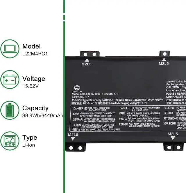 • Model: L22M4PC1 // Voltage: 15.52V // Capacity: 99.9Wh 6440mAh // Color: Black // Type: Plug & Play Li-ion Battery.