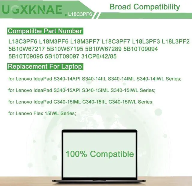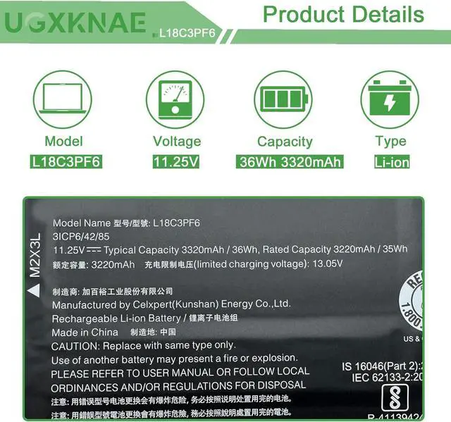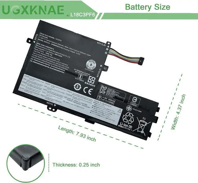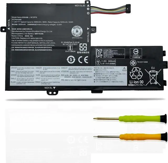 Specifications: Model Name: L18C3PF6 standard Rechargeable Li-ion Battery; Battery Type: Lithium_ion; Voltage: 11.25 V; Capacity: 36 Wh 3320 mAh. Color: Black. Packages includes:1x L18C3PF6 Laptop Battery, 2 x Screwdrivers for easy installation, 1x Instruction