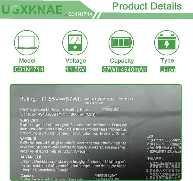 Specifications: Model Name: C31N1714 standard Rechargeable Li-ion Battery; Battery Type: Lithium_ion; Voltage: 11.55 V; Capacity: 57 Wh 4940 mAh. Color: Black. Packages includes:1x C31N1714 Laptop Battery, 2 x Screwdrivers for easy installation, 1x Instruction