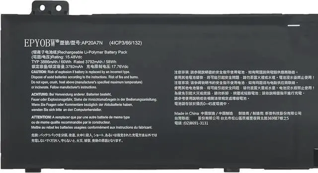 Help others learn more about this product by uploading a video!EPYOBW AP20A7N Laptop Battery 60Wh 3886mAh 4-Cell 15.48V Compatible with Acer Predator Triton 300 SE PT314-51S PT314-51S-51NZ PT314-51S-53D2 PT314-51S-53W3 Series 4ICP3/66/132 KT00407010