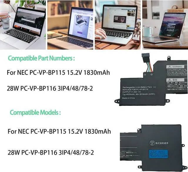 Power your for NEC PC-VP-BP115 and PC-VP-BP116 laptops with this OEM-certified replacement battery, designed for seamless compatibility and long-lasting performance. Engineered with 15.2V 1830mAh (28Wh) Lithium-Ion cells, this high-capacity battery ensures up to 8 hours of uninterrupted usage, ideal for professionals, students, and frequent travelers.