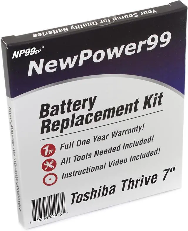 Replace your Toshiba Thrive 7" Battery or Keep an Extra Battery on hand as a backup. This kit comes with a 5000 mAh, Lithium-Polymer Battery. Works in your Toshiba Thrive 7" Tablet. Simple, Easy and Inexpensive! You get a New Long Lasting Rechargeable Battery, Easy to Follow Video Instructions, and Free Special Tools needed for battery installation, AND You also get a full ONE YEAR Money Back Guarantee exclusively when you purchase from us.