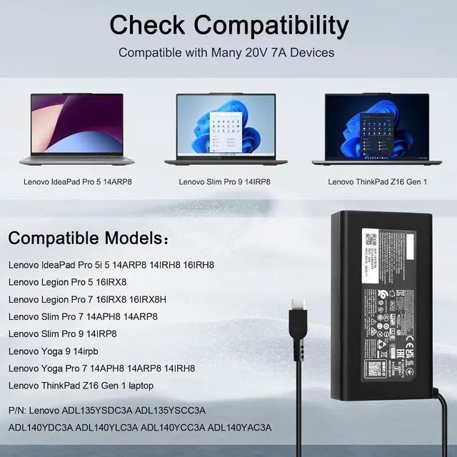 Power: 135w 140w Max. ^^140W 135W Charger for Lenovo ADL135YSDC3A ADL135YSCC3A Lenovo ThinkPad Z16 Gen 1 ThinkPad 135W AC Adapter (USB-C) 4X21H27800^^140W 135W Charger for Lenovo Legion Pro 5 16IRX8, Lenovo Legion Pro 7 16IRX8 16IRX8H power supply, Lenovo IdeaPad Pro 5i 5 14ARP8 14IRH8 16IRH8 laptop ac adapter^^140W 135W Charger for Lenovo Slim Pro 7 14APH8 14ARP8, Lenovo Slim Pro 9 14IRP8, Lenovo Yoga 9 14irpb, Lenovo Yoga Pro 7 14APH8 14ARP8 14IRH8, Lenovo Slim Pro 9 14IRP8 power cord^^140W 135W Charger for Lenovo ADL140YDC3A ADL140YLC3A ADL140YCC3A ADL140YAC3A ac power adapter