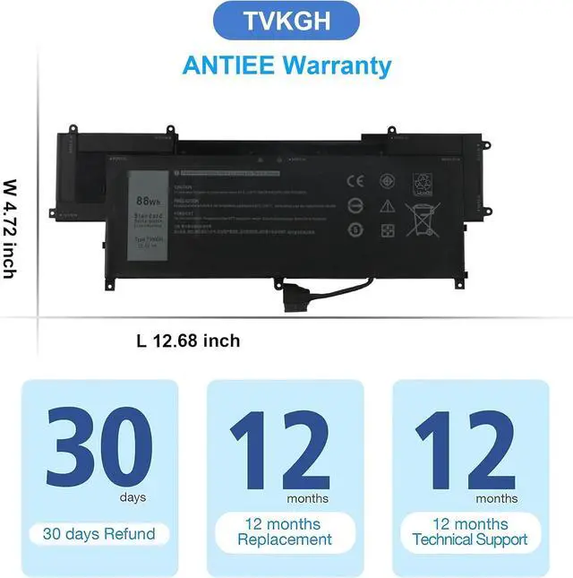 ANTIEE TVKGH 88Wh Laptop Battery Replacement for Dell Latitude 9510 / Latitude 9520 2-in-1 Series N7HT0 V5K68 HYMNG N2NLL 08NFC7 N2NLL N7HTO 089GNG 0PKW00 0HYMNG 11.4V 7334mAh 6-Cells