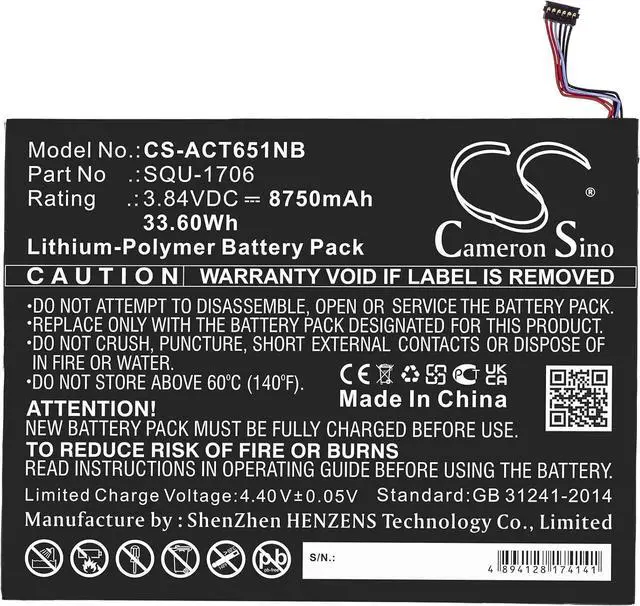 : Li-Polymer, Voltage: 3.84V, Rate: 8750mAh/ 33.60W h.