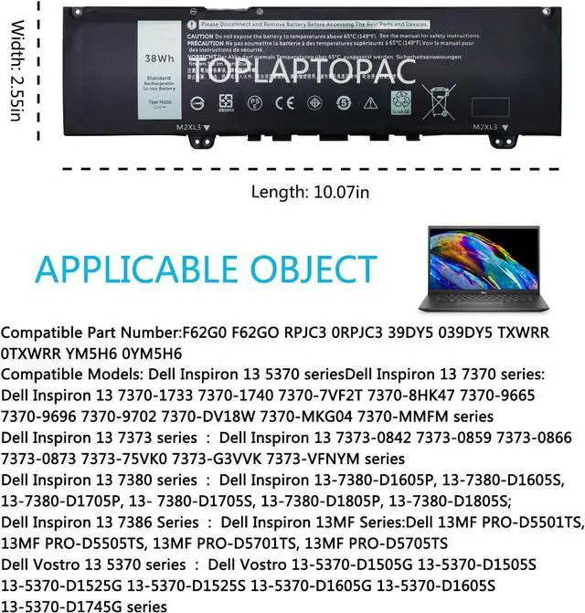 Battery Type: Li-ion Voltage: 11.4V Capacity: 38Wh Color: Black Replace Part Number: F62G0 CHA01 RPJC3 Fit for: Dell Vostro 5370 Series Dell Inspiron 13 5370 Series Dell Inspiron 13 7370 Series Dell Inspiron 7373 Series