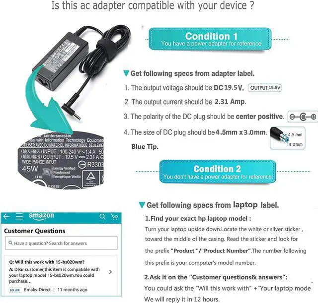 45W 65W Emaks Ac Adapter/Laptop Charger/Power supply for HP Pavilion 15-F:15-f111dx 15-f272wm 15-f211wm 15-f271wm 15-f233wm 15-f387wm 15-f211nr 15-f337wm 15-f224wm 15-f269nr af093ng and more hp laptop