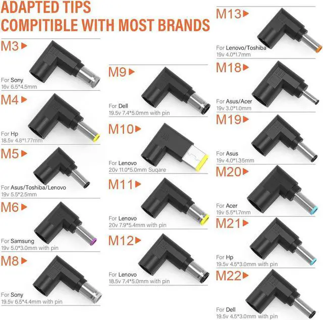 90W Universal Laptop Charger 15-20V Tip's Dimensions and Compatible Brands