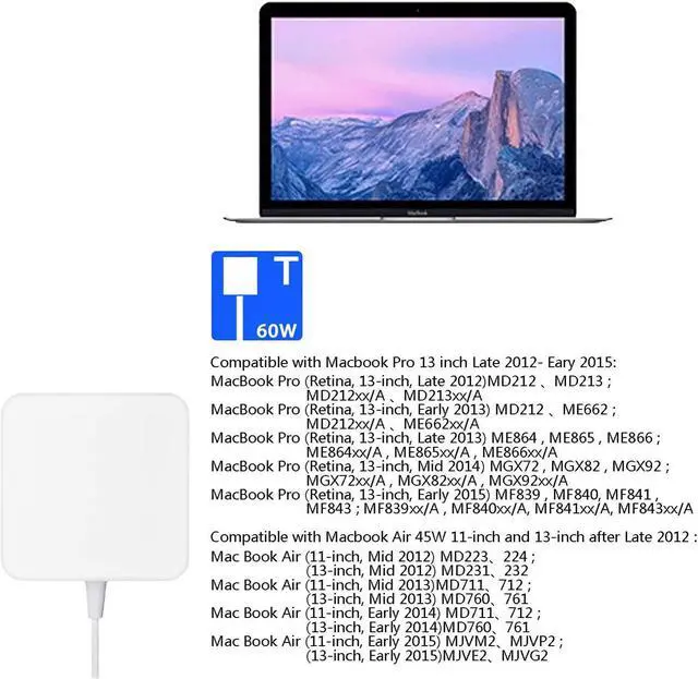 60Watt T-Tip Mac Power Charger Compatible with Macbook Pro 13 inch Late 2012- Eary 2015: