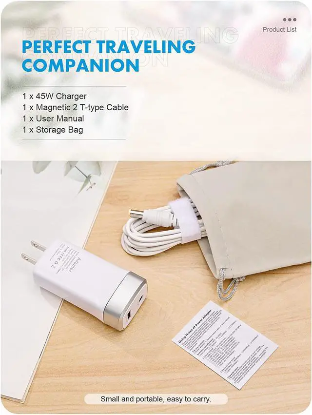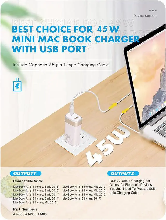 Compact macbook air charger has one extra USB port design.when charging your macbookits also can charge other devices.And its portable design is easy to carry, take it to anywhere you want.