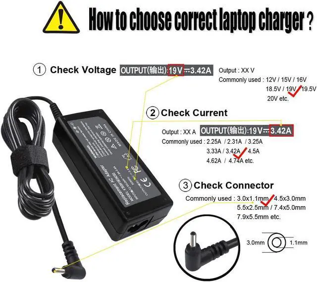AC Input : 100 - 240V, 50~ 60Hz ; DC Output : 19V--3.42A ; Barrel size : 3.0*1.1mm