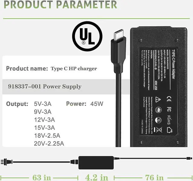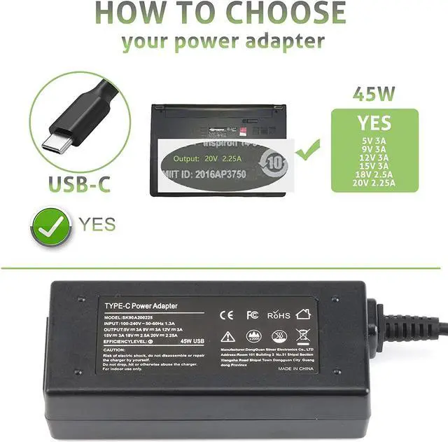 Output : 20V-2.25A, 5V-3A, 9V-3A, 15V-3A, 18V-2.5A; Input:100V-240V AC 50/60Hz Max 1.3A; Connector :USB C Port( Fit for more USB-C laptops and smart phones that support USB TYPE-C.CE-/FCC-/ROHS-Certified! With premium ABS+PC fireproof materials and Built-in IC chip technology provide Overcharge Protection System/ Short-circuit/Overload protection/Over-heat protection)