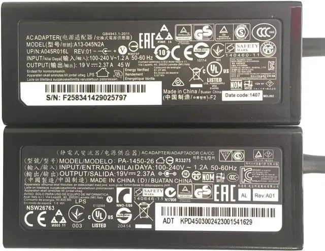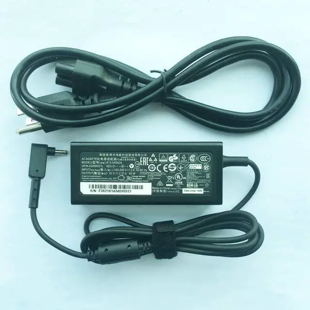 Input:100-240V 50-60Hz Output:19V2.37A 45W 3.0*1.1mm Part numbers AK.045AP.061, AK.045AP.075 A13-045N2A PA-1450-26 NT.L6SAA.005 PLEASE NOTE: not compatible with CB5-571 Compatible Models: Acer Chromebook 11 C730 C730E C735 C730E-C4BA Acer Chromebook R 11 R11 CB5-132T C738T CB5-132T-C8ZW CB5-132T-C9KK CB5-132T-C1LK C738T-C44Z Acer Chromebook 13 CB5-311 CB5-311P C810 C810-T7ZT Acer Chromebook 14 CB3-431 CB3-431-C5FM CB3-431-C0AK CB3-431-C3WS CB3-431-C5EX Acer Chromebook 15 CB3-531 CB3-532 CB3-531-C4A5 CB3-532-C47C CB3-532-C8DF Acer Chromebook 11 CB3-111 CB3-131 CB3-132 CB3-131-C3SZ CB3-131-C3KD CB3-111-C670 CB3-111-C8UB Acer Chromebook 11 N7 C731 C731T C731-C8VE CB311-7H CB311-7HT N16Q13 Acer Aspire R 14 R14 (Small Pin) R5-471T Acer Spin 1 SP111-31 SP111-31N SP111-32N SP111-33 SP113-31 Acer Switch Alpha 12 SA5-271 SA5-271P Acer Switch 3 5 SW312-31 SW312-31P SF515-51T SF515-51T SF313-51 SF314-41 SF314-55 SF314-51 SF314-52 SF314-52G Acer Spin 3 5 SP513-51 SP513-52N SP314-52 SP513-53N SP314-51 Acer Aspire R 13 R13 R7-371T R7-372T Acer Aspire V 13 V13 Touch V3-331 V3-371 V3-372 V3-372T Acer Aspire S 13 S13 S5-371 S5-371T Acer TravelMate Spin B1 B118-R B118-RN TMB118-RN B118-G2-R B118-G2-RN,P2 P214-51 Aspire Switch 11 12 11 V 12 S SW5-171P SW5-171 SW5-111P SW5-111 SW5-173 SW5-173P SW5-271 SW5-271P SW7-272 SW7-272P
