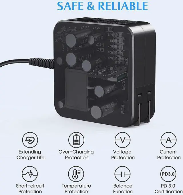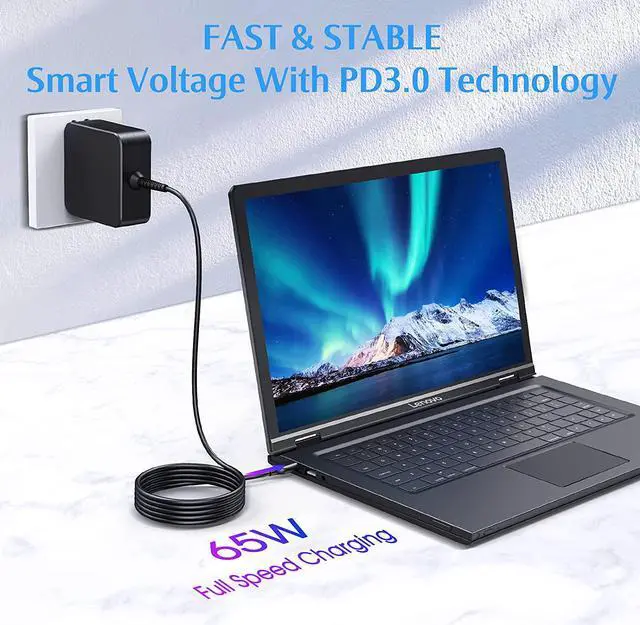 [COMPATIBLE] -- With PD 3.0 technology and adjustable output voltage (5V/9V/12V/15V/20V), it supports the fast charging of any USB Type-C devices up to 65 watt from laptops to tablets to smartphones.